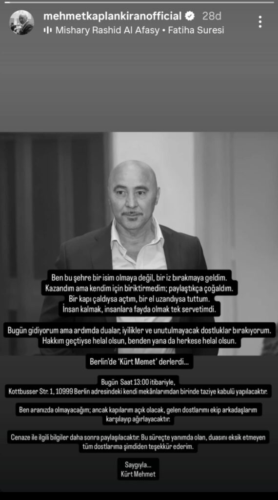 Mehmet Kaplankıran, özellikle Berlin’deki Türkiyeli toplum içinde tanınan bir figürdü. “Kürt Mehmet” lakabıyla bilinen Kaplankıran’ın, inşaat ve gastronomi sektörlerinde faaliyet gösterdiği, iş dünyasının yanı sıra sosyal ve yardım faaliyetleriyle de öne çıktığı biliniyor. Vefatı, Berlin’deki ilgili çevrelerde üzüntüyle karşılandı.