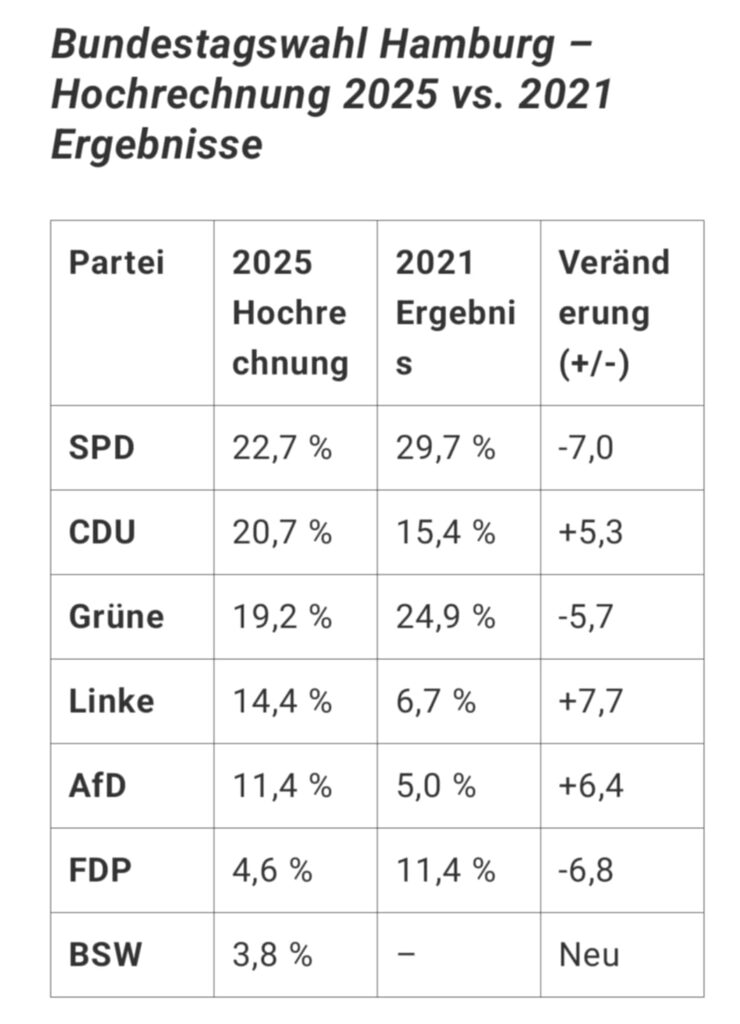 Hamburg’da gerçekleşen Bundestagswahl seçimlerinde SPD, büyük bir hezimet yaşadı. Son açıklanan yüksek tahminlere göre SPD, %22,7 oy oranıyla birinci sırada yer alsa da, 2021 seçimlerine göre %7 oranında kayıp yaşadı. Bu düşüşle birlikte SPD, Hamburg’da tarihinin en kötü sonuçlarından birini aldı.