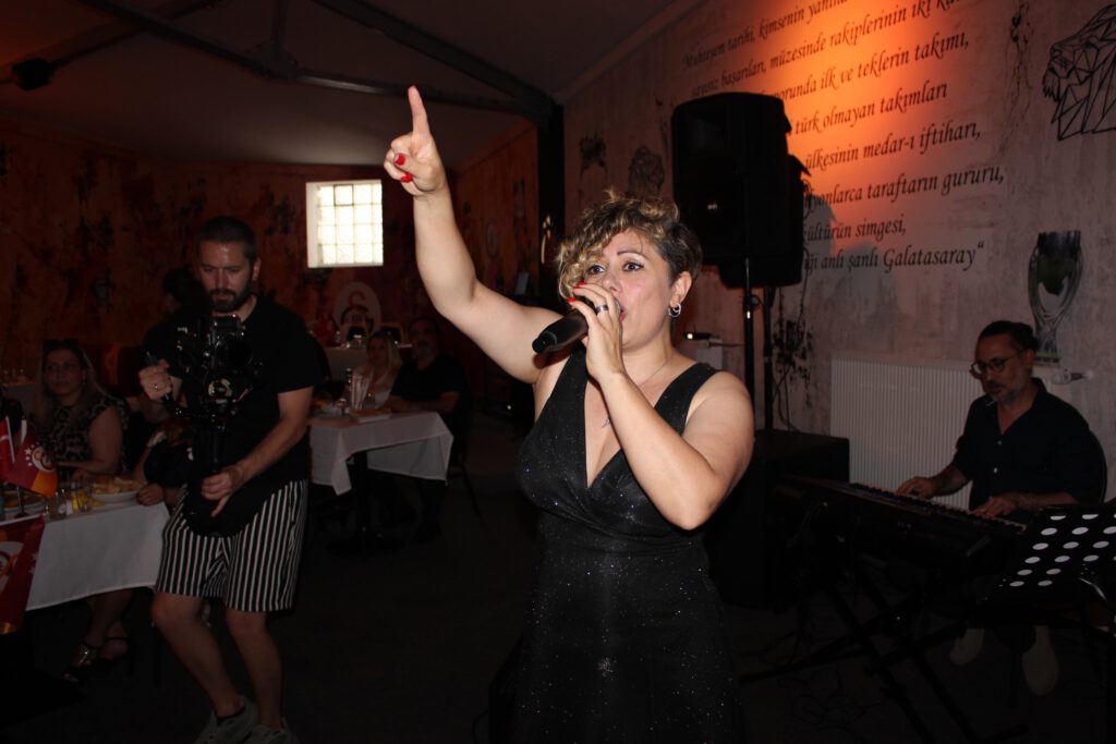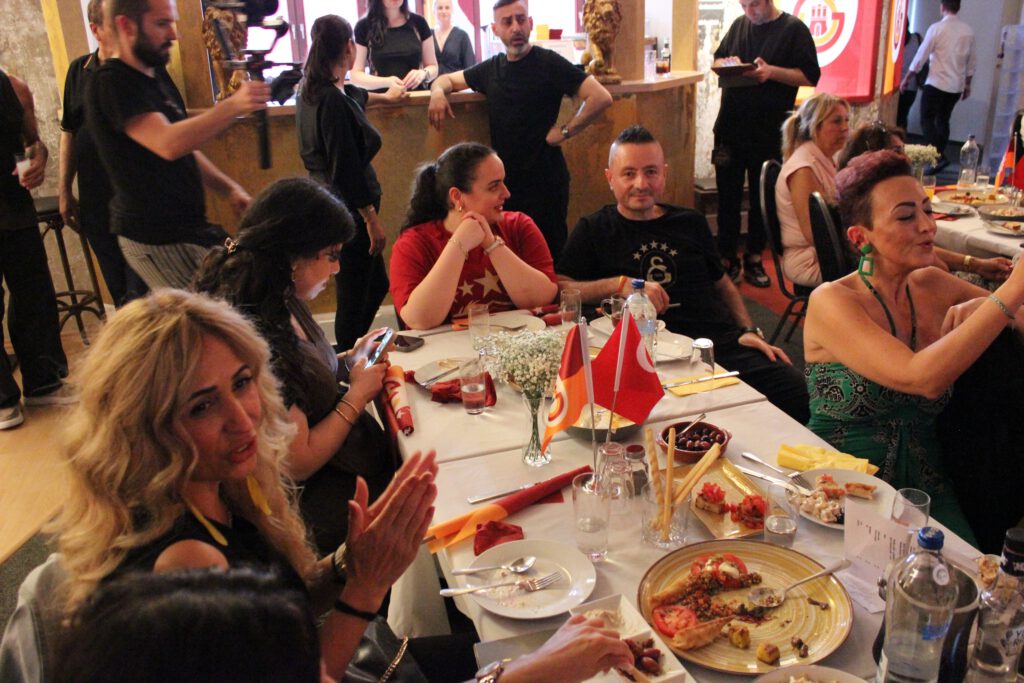 Sarı kırmızılı takımın Türkiye Kupası ve Süper Lig’deki 25. Şampiyonluğunu kutlama gecesinin atmosferi, Galatasaray’ın görkemli tarihine ve zaferlerine yakışır bir şekilde baştan sona düzenlenmişti. Salon, Galatasaray bayrakları ve temalı süslemelerle donatılmış, her köşede şampiyonluk ruhu hissediliyordu. Davetlilerin masaları da sarı-kırmızı detaylarla süslenmişti; görselde de görüldüğü gibi, masaların üzerindeki küçük Galatasaray bayrakları ve amblemler, taraftarların aidiyet duygusunu pekiştiriyordu. Katılımcıların yüzlerindeki gülümsemeler ve sohbetler, gecenin ne kadar keyifli ve samimi bir ortamda geçtiğinin en açık göstergesiydi. Her yaştan Galatasaraylının bir araya geldiği bu gece, adeta büyük bir aile buluşması havasındaydı.